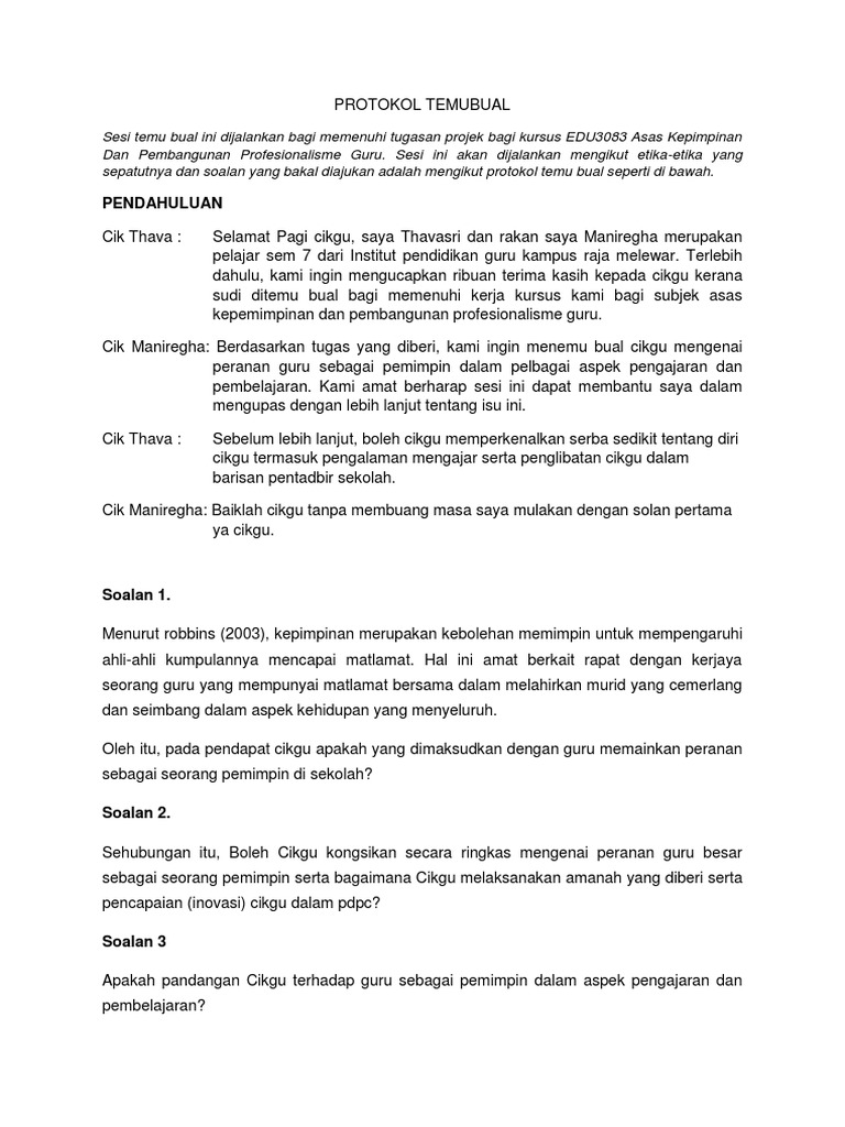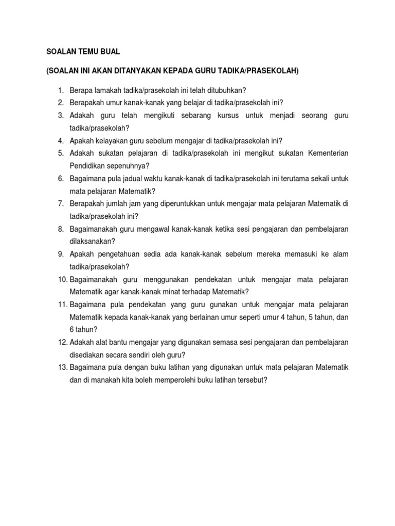 . Bagaimanapun untuk melakukan temubual pengkaji memerlukan protocol interview. Soalan temu ramah Tingkah Laku Kerja Berpasukan Jelaskan situasi di masa lalu di mana anda menunjukkan kerja berpasukan yang kuat Apa gaya pengurusan anda Beritahu saya. Soalan Temuduga Guru dan Jawapan yang Disyorkan.